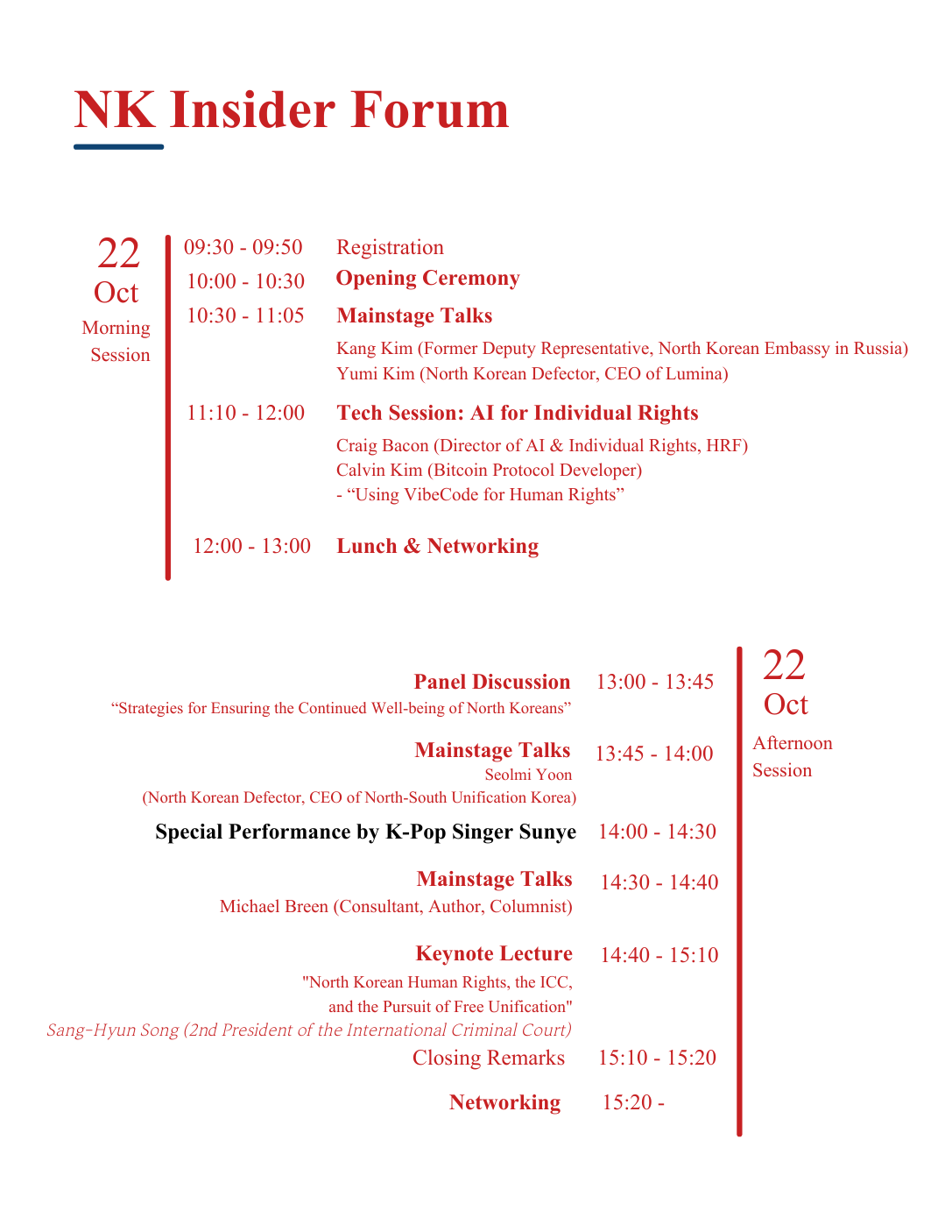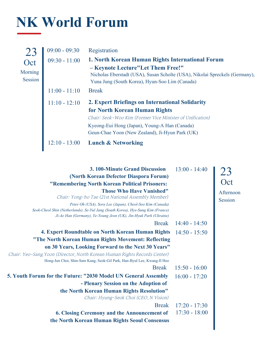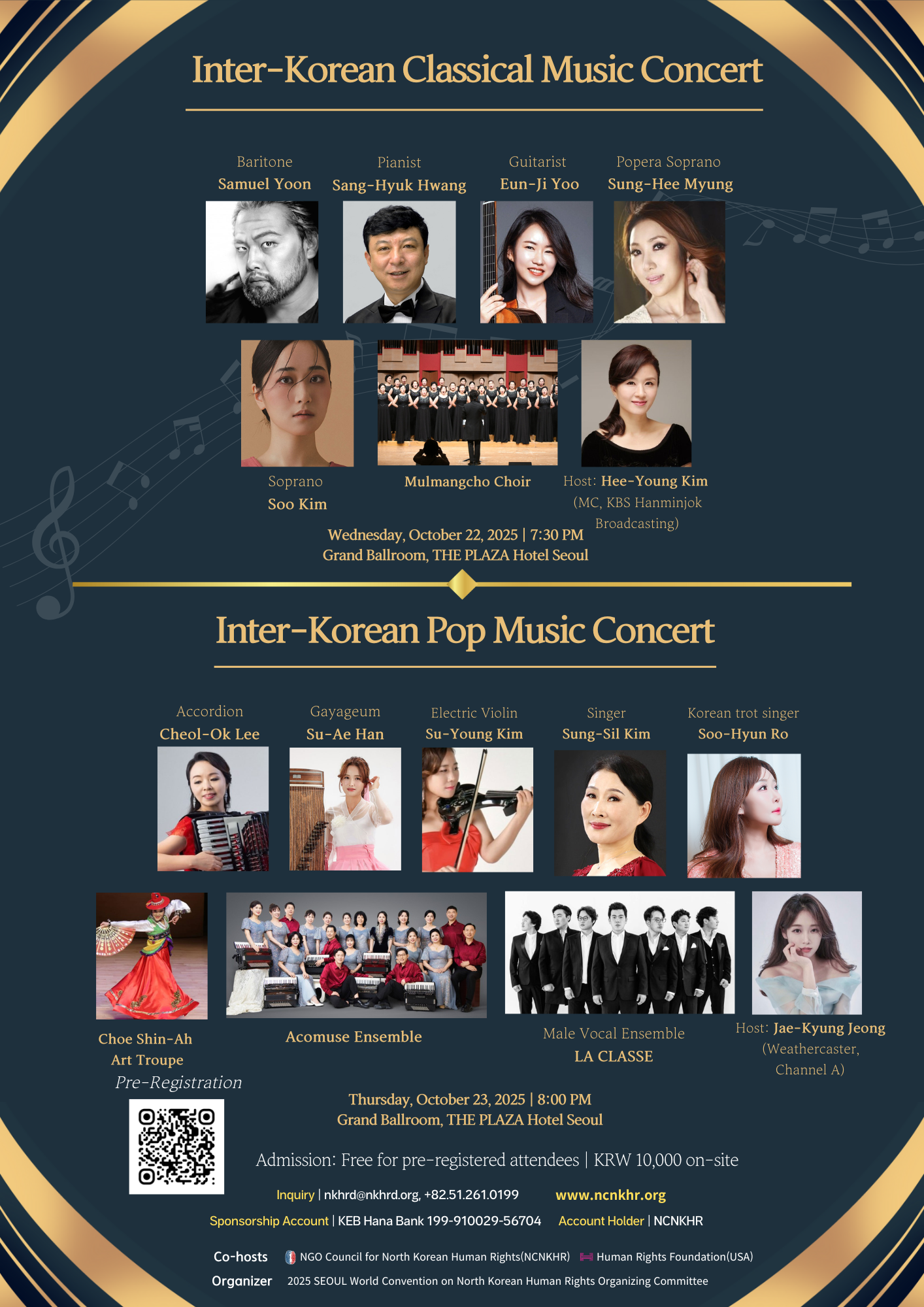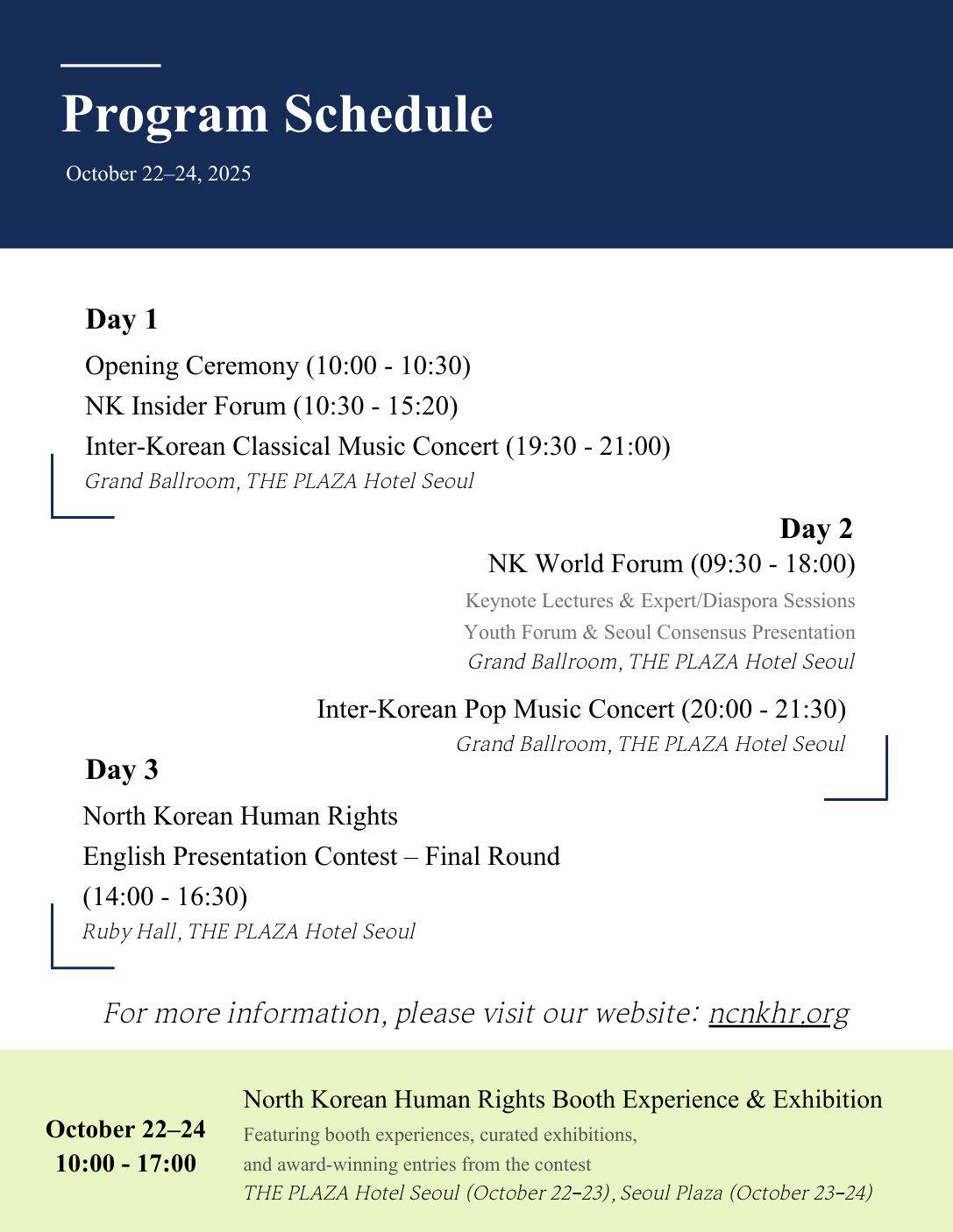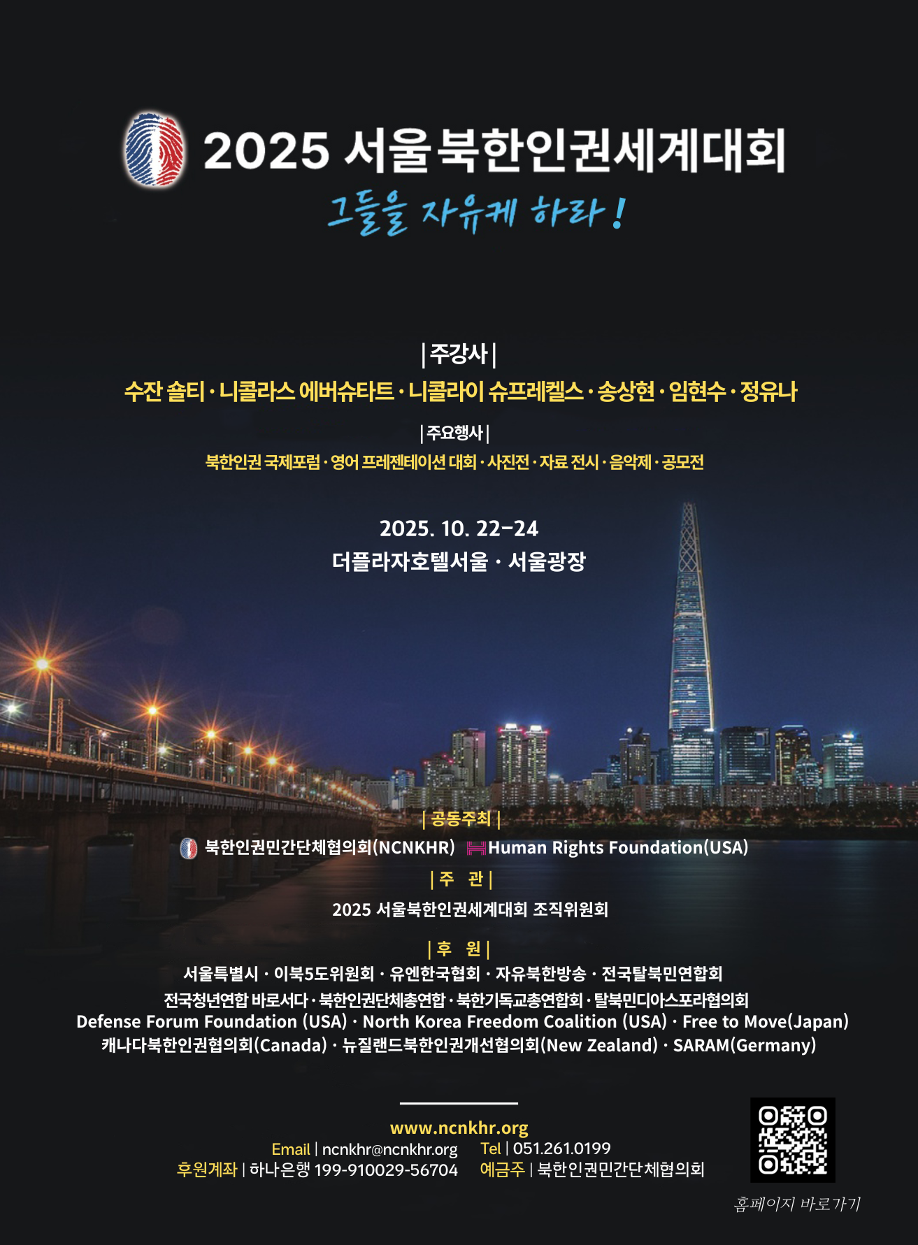 국내외 76개 북한인권단체 협의체인 북한인권민간단체협의회와 미국 인권재단(Human Rights Foundation, USA)이 공동주최하며, 2025년 10월 22~24일 더플라자호텔서울서울광장에서 열립니다.